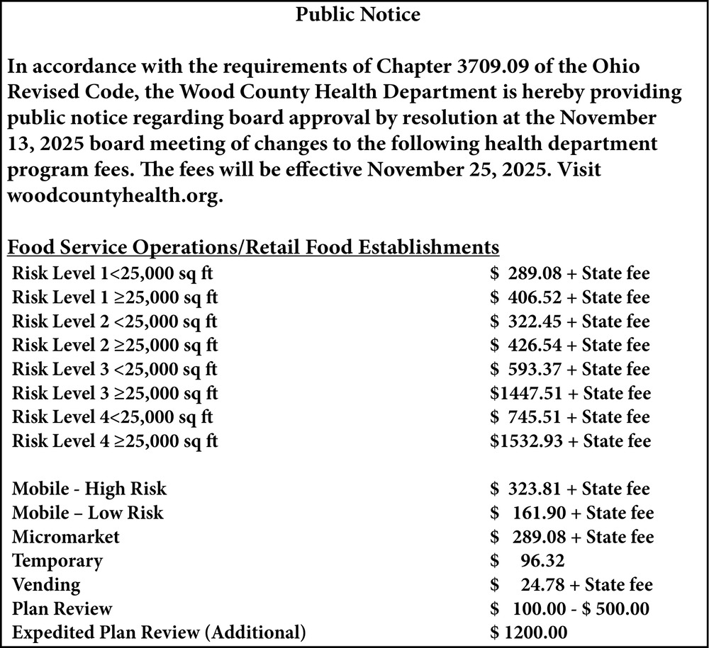 Nov 15, 2025. Wood County Health Department Government Ads from Sentinel-Tribune