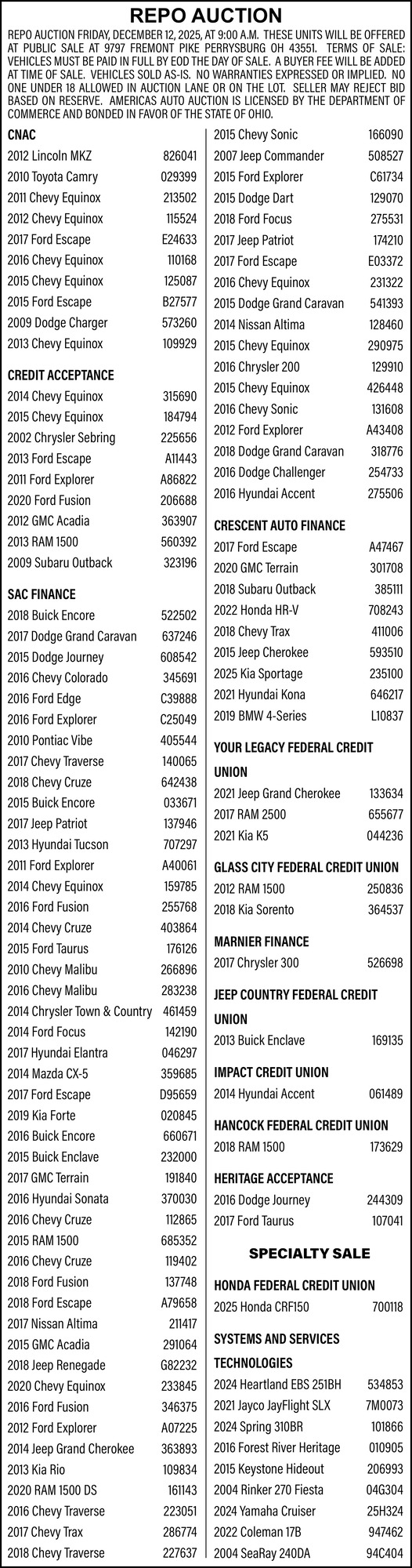 Nov 29, 2025. Repo Auction Auctions Ads from Sentinel-Tribune