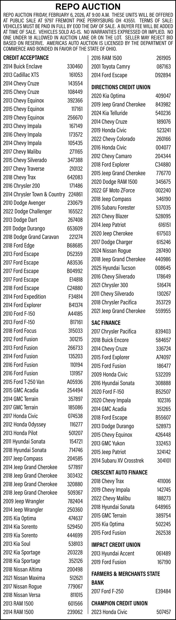 Jan 24, 2026. Repo Auction Auctions Ads from Sentinel-Tribune