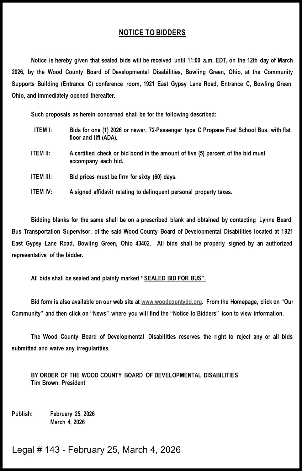 Feb 25, 2026. Wood County Board of Developmental Disabilities Government Ads from Sentinel-Tribune