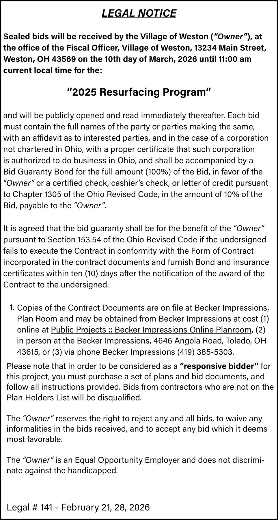Feb 21, 2026. Village of Weston Government Ads from Sentinel-Tribune