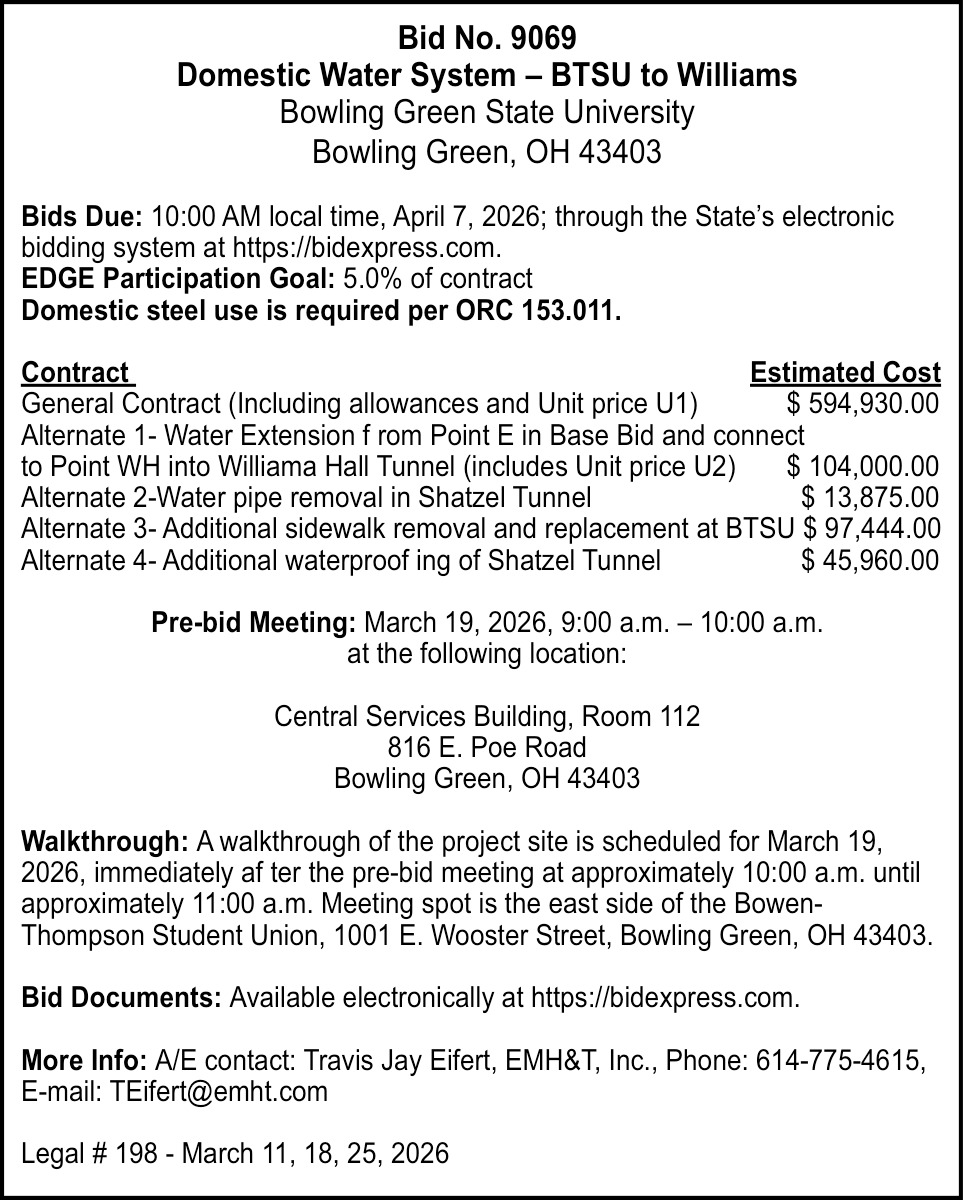 Mar 11, 2026. Bowling Green State University Public Notices Ads from Sentinel-Tribune
