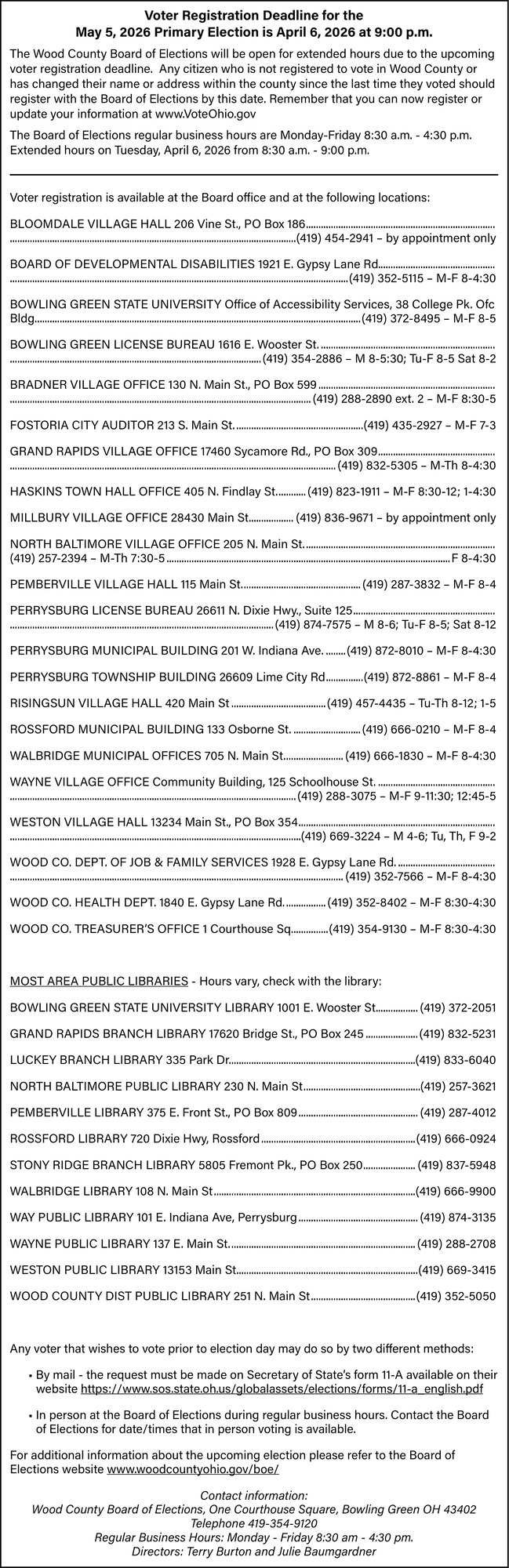 Mar 21, 2026. Wood County Board of Elections Government Ads from Sentinel-Tribune