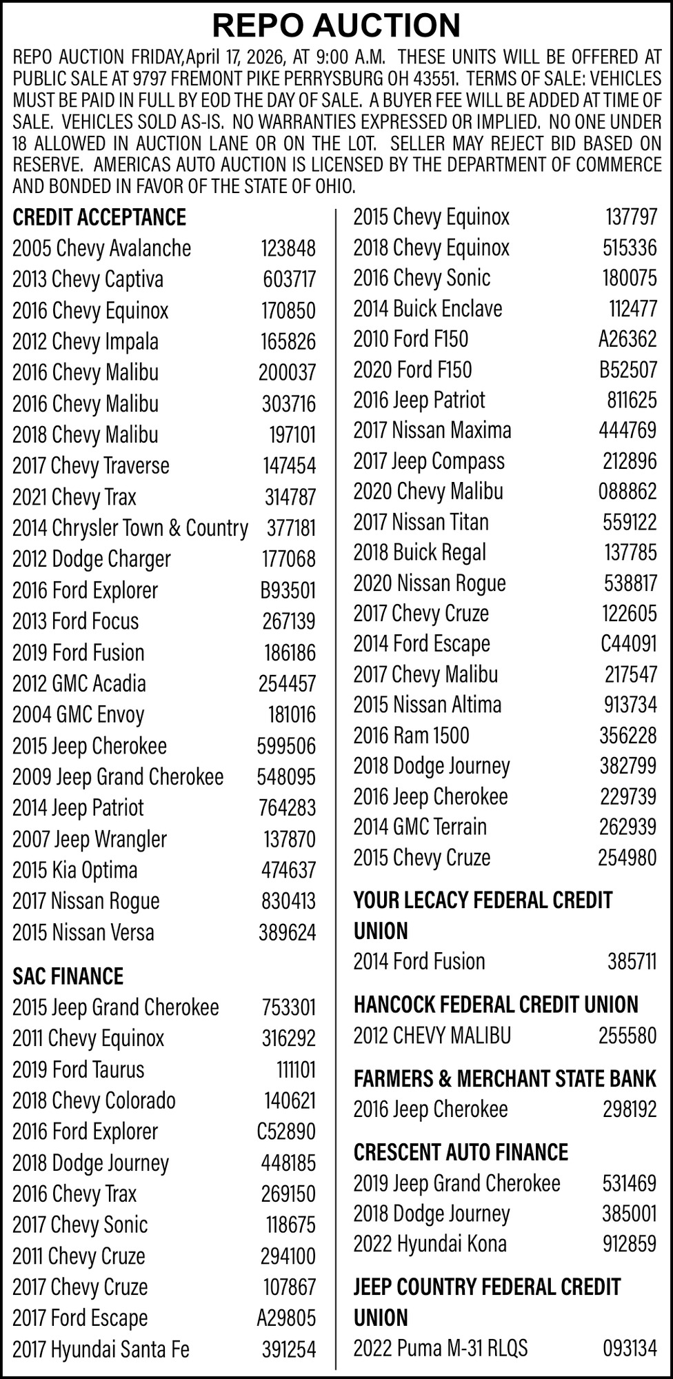 Apr 04, 2026. Repo Auction Auctions Ads from Sentinel-Tribune