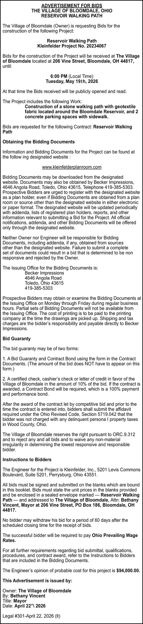 Apr 22, 2026. Village of Bloomdale Government Ads from Sentinel-Tribune